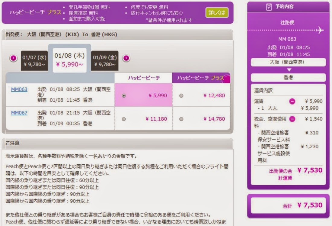 大阪飛香港單程5,990円(約HK$386),再加330円手續費以及稅項約,7,860円(約HK$507);