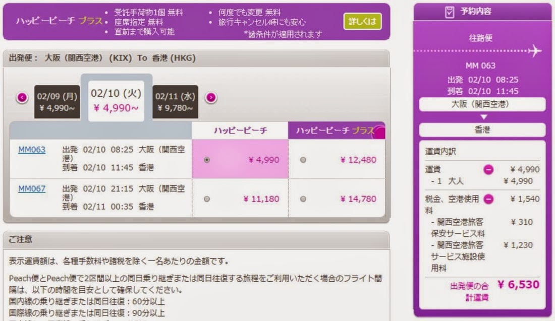 大阪飛香港,2015年2月出發,4,990円(約HK$322),連稅約HK$443;