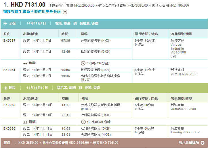 今次阿聯酋航空經杜拜轉飛歐洲,價錢都OK,部份航點比琴日瑞航優惠仲平少少。Check過系統,最平機位集中於11月頭至11月中,其他日子可能要貴HK$200至$400不等。