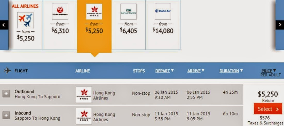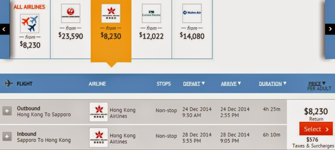 HK Airlines香港航空已正式開賣香港直航去北海道札幌機票$5,250起(連稅$5,826),首航日期為2014年12月19日;