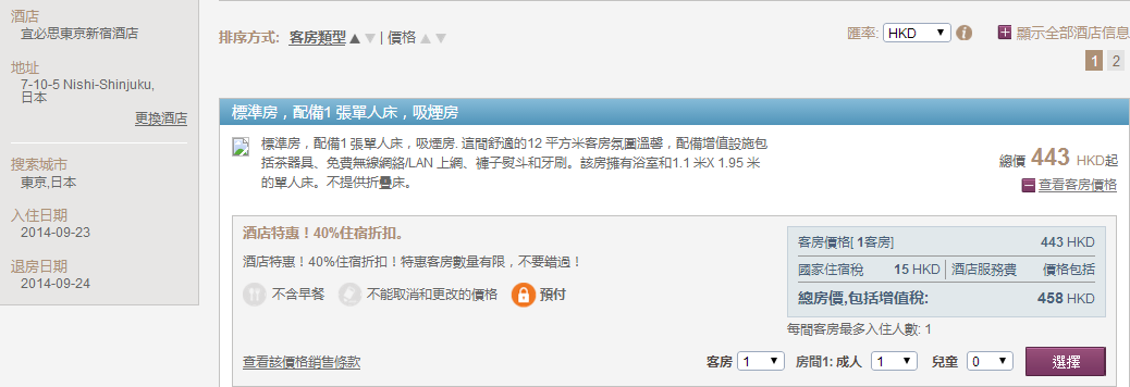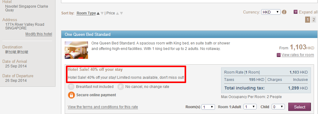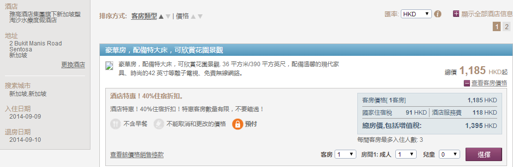 測試過不是每個日子都有優惠,要見到「Hotel Sale 40%(30%) off your stay」先係今次優惠。