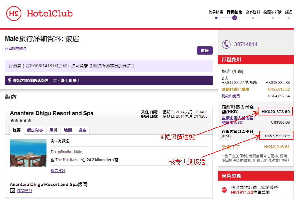當然要比較其他訂房網,發現其中Hotelclub最抵,4晚房價+機場接送=HK$23,164連稅,平均每晚約HK$5,791,順便試埋入住3晚價錢,平均每晚約HK$7,266,都係平左2成。(價錢已使用89折優惠碼計算)
