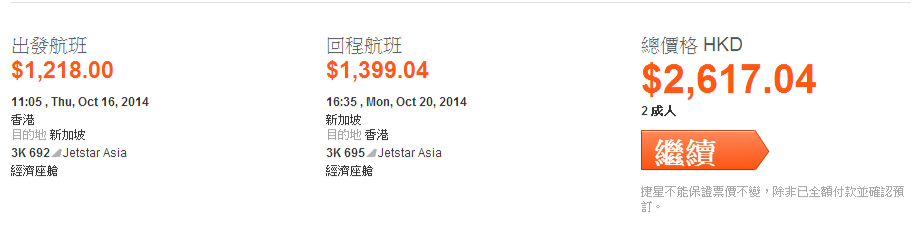 香港去新加坡2人單程價$756(來回連稅$2,617),平均每人$1,309,同之10週年優惠比價錢差唔多,如果諗住10月去新加坡可考慮下。