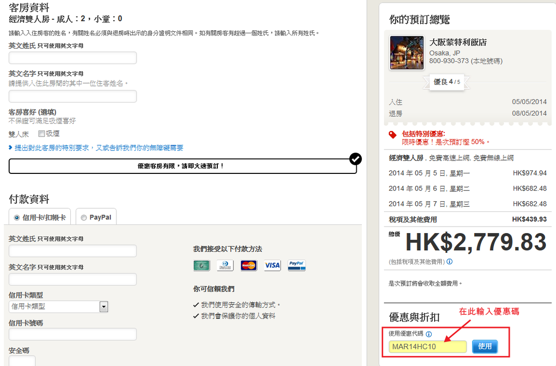US$50(約HKD$390)優惠碼,訂房滿US$300(約HKD$2,340)即可使用